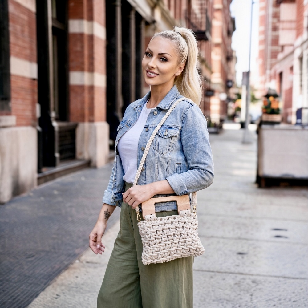 Διαθέτει εντυπωσιακή ξύλινη λαβή που προσδίδει natural chic ύφος, ενώ συνοδεύεται από πλεκτό λουράκι, ώστε να μπορεί να φορεθεί άνετα είτε στον ώμο είτε χιαστί, προσαρμόζοντας το στυλ στις ανάγκες της ημέρας.